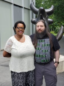 Mr. and Mrs. Peter and Carmen Baylies stand in front of a bull sculpture in the North Carolina Museum of Art’s Bonsai Garden. Photo credit: an art goer who offer to helped snap a picture of The Baylies